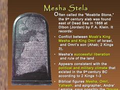 I am Mesha, son of Kemosh[-yatti], the king of Moab, the Dhibanite. My father was king over Moab for thirty years, and I became king after my father. And I made this high-place for Kemosh in Qarcho . . . because he has delivered me from all kings, and because he has made me look down on all my enemies.